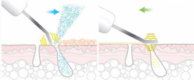 2.The skin scrubber is then flipped over so the metal tip is flat to the skin in order to begin sonophoresis. Sonophoresis is a process that exponentially increases the absorption of topical serums into the epidermis and dermis of the skin. Sonophoresis occurs because ultrasound waves stimulate micro-vibrations within the skin epidermis and increase the overall kinetics energy of molecules making up topical agents.
